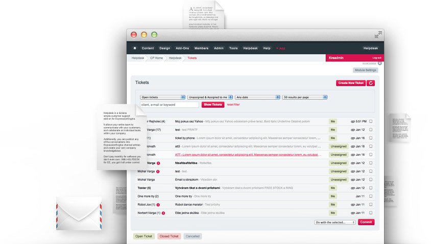 Gather e-mails from a selected mailbox and enquiries submitted from the web into a shared inbox in ExpressionEngine. Reply to messages or delegate them to other Helpdesk users and then publish your communications into EE channel entries.
